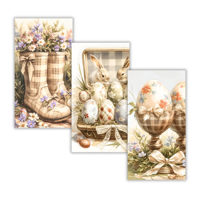 Ez a nyomtatott dekorkartonból készült húsvéti pasztell tábla szett 3 darabos kiszerelésben érhető el, vintage stílusú mintákkal. Finom színei és időtálló megjelenése miatt ideális választás tavaszi és húsvéti dekorációkhoz, koszorúkhoz vagy egyedi ünnepi elrendezésekhez. Könnyű kialakításának köszönhetően sokoldalúan felhasználható - legyél kreatív, és alkoss harmonikus, egyedi dekorációkat.​Méret: 9,5x5cm