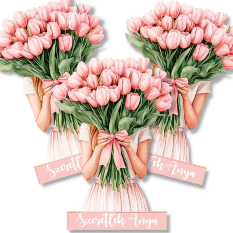 Ez a nyomtatott dekorkarton csomag három darab Tulipános lány dekorációt tartalmaz, „Szeretlek Anya” felirattal kiegészítve. Saját gyártású termék, amely tökéletes választás anyák napi dekorációhoz, ajándékkísérőkhöz vagy bármilyen otthoni kreatív összeállításhoz. Könnyű anyaga miatt egyszerűen rögzíthető, és jól kombinálható más tavaszi dekorációs elemekkel.  Méret:7x5cm